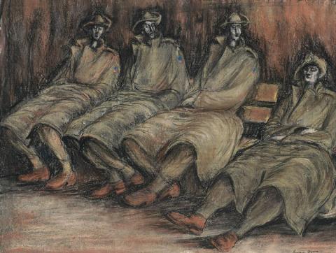 Drysdale was not accepted for military service because of his impaired eyesight. When the Drysdale family moved to Albury for six months in 1942, however, they were surrounded by soldiers from the several military camps nearby - and especially the congregations at the Albury railway station, always crowded with troops waiting for the trains. In those days the railway gauges of Victoria and New South Wales were different. All passengers and freight had to change at Albury. The wait was often long with soldiers sleeping wherever they could, as in Soldiers, Albury Station. The attraction of the wartime station and its crowds was such that it took on the significance of a theme in Drysdale's art. A number of related drawings and paintings include two gouache and ink versions of Albury Platform, 1943, one being in the collection of the Albury Regional Arts Centre. The wartime ‘brownout’ added to the sepulchral feel of many of these works, aided by Drysdale's use of a limited palette, the flicker of painted light, and the textured, sculptural handling of the figures. Drysdale had been influenced by the drawings of the British sculptor Henry Moore, which he had seen in London in 1939.3 Added stimulus was given by the illustration in the September 1941 issue of Art and Australia of several of Moore's drawings of people sleeping in the London underground, tomb-like figures in their make-shift air raid shelters.4 This enhancing influence is apparent in the sprawling, laconic figures of Soldiers, Albury Station, especially in the way in which Drysdale sought to suggest form by highlighting the sense of the body beneath the heavy trench coats. To this he added three masterly Drysdale characteristics - objectivity, stoicism and silence.